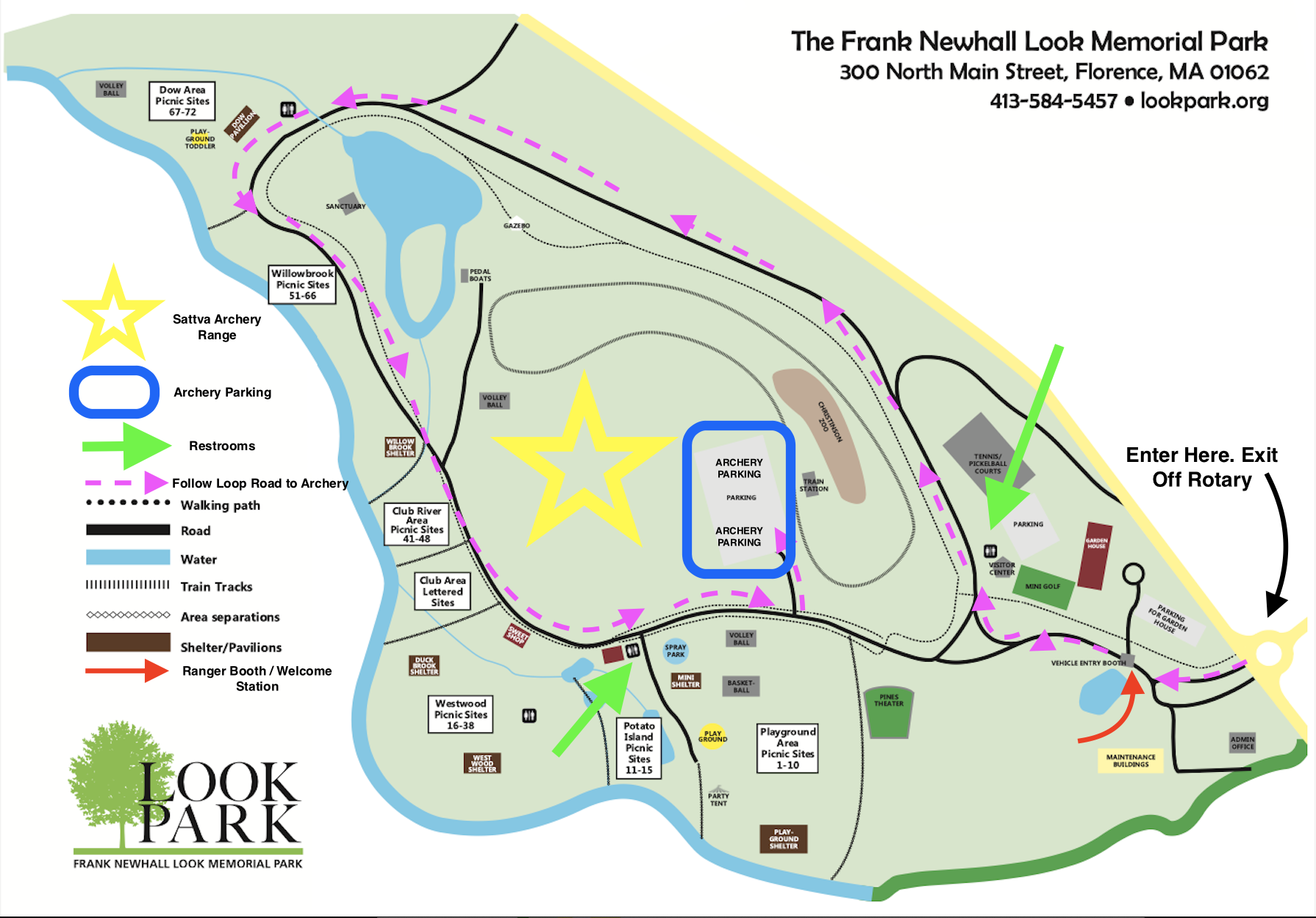 - The Sattva archery range (red rectangle on the map below) is in the center of the park, on the interior of the loop, always to your left as you go around the one-way loop road.